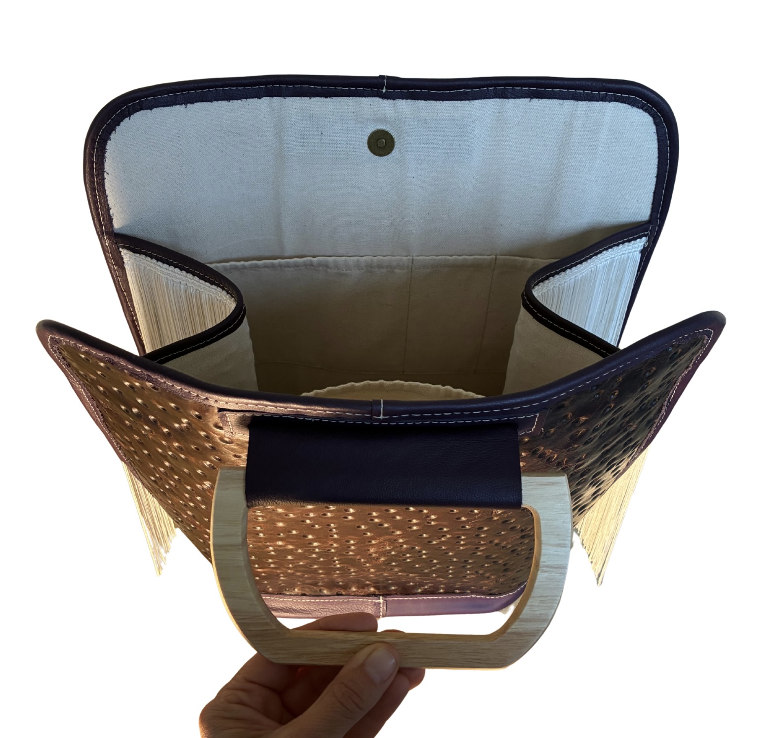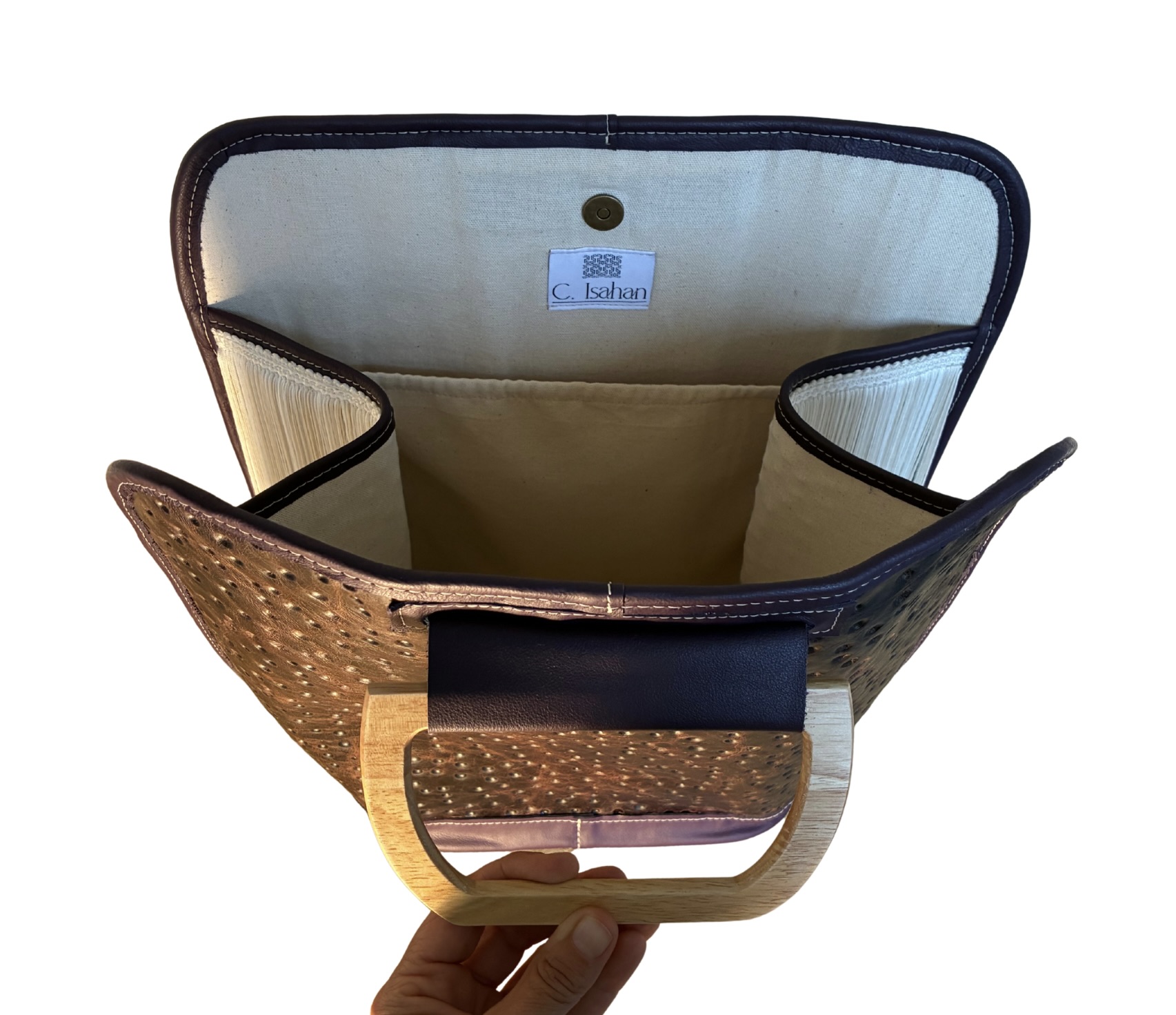 The tote is designed to open wide ~ giving clear visual and physical access to contents.